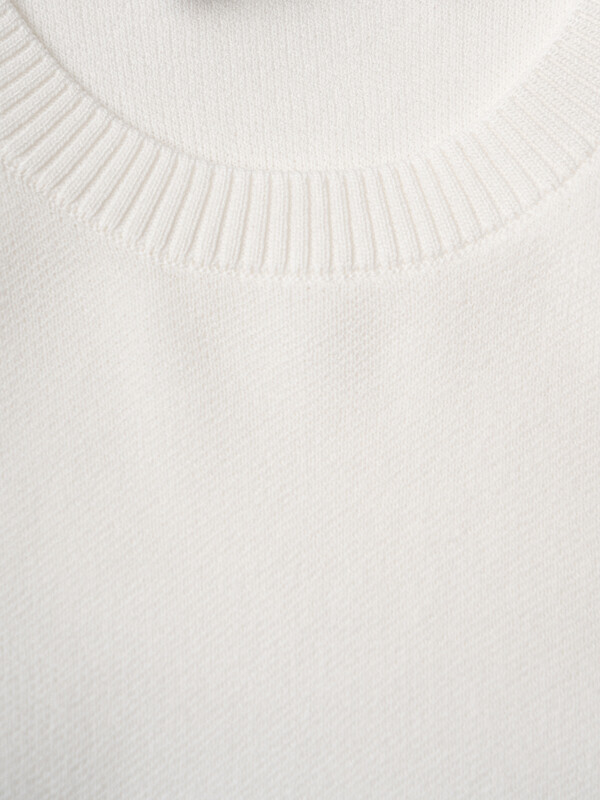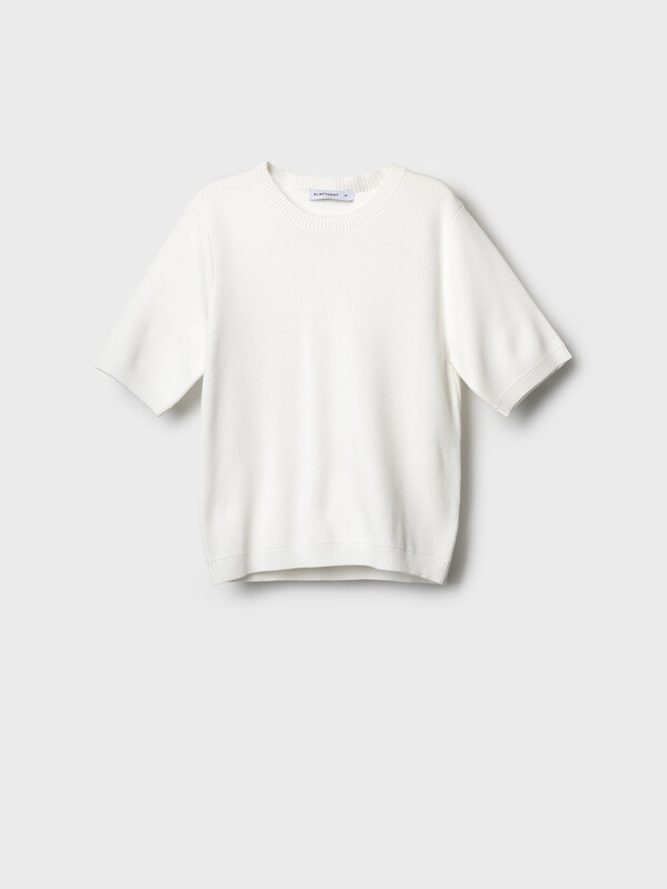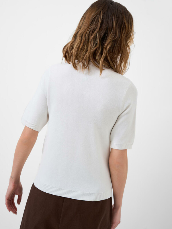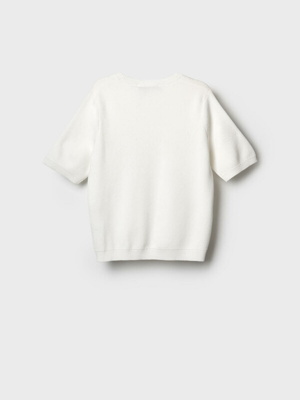 Женский джемпер. Модель средней длины, выполнен из тонкого мягкого трикотажа с жаккардовой фактурой. Имеет прямой крой и короткие рукава. Горловина, низ и края рукавов оформлены резинкой.