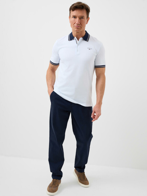 Мужская футболка-поло. Модель прямого кроя, средней длины с короткими рукавами. Выполнена из мягкого, хлопкового трикотажа пике. На груди расположен аккуратный принт. Застежка на три пуговицы. По бокам — небольшие разрезы с контрастной отделкой.