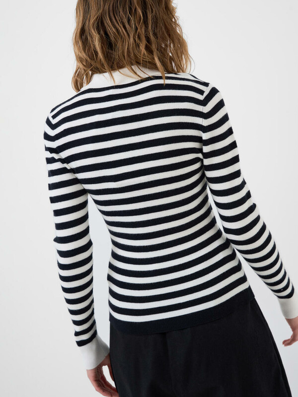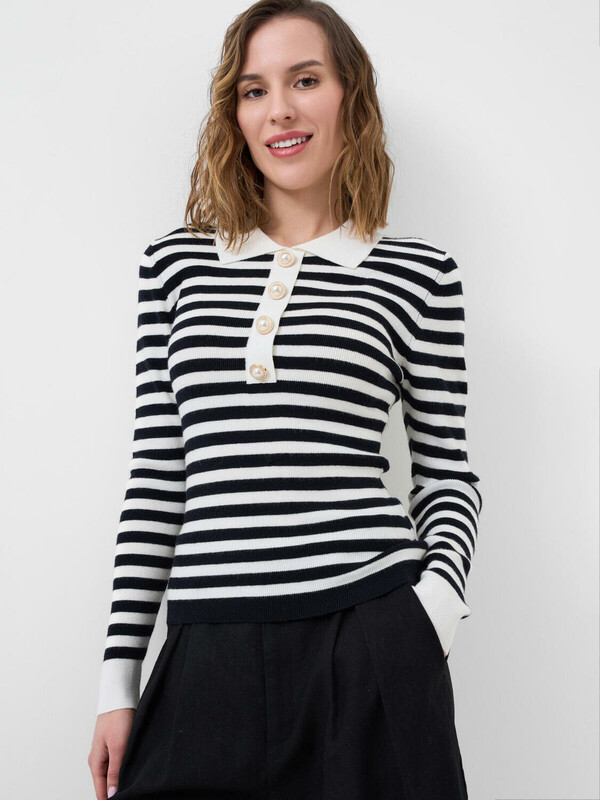 Женский джемпер. Модель в морском стиле с классическим воротником поло и длинными рукавами. Застёжка на четыре пуговицы спереди. Изделие выполнено из мягкого вязаного трикотажа.