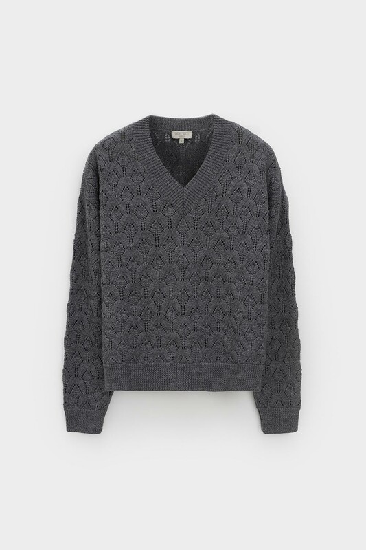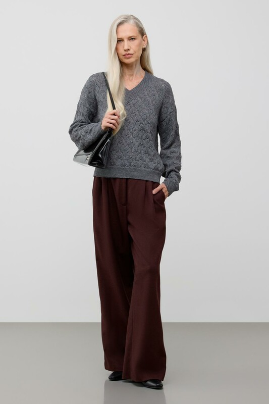Мягкий вязаный джемпер с V-вырезом из премиальной пряжи, созданный с использованием инновационной технологии смешанного волокна. Деликатное сочетание шерсти и акрила обеспечивает непревзойденный комфорт: изделие нежно облегает фигуру, гарантирует мягкость прикосновения и сохраняет безупречную форму.