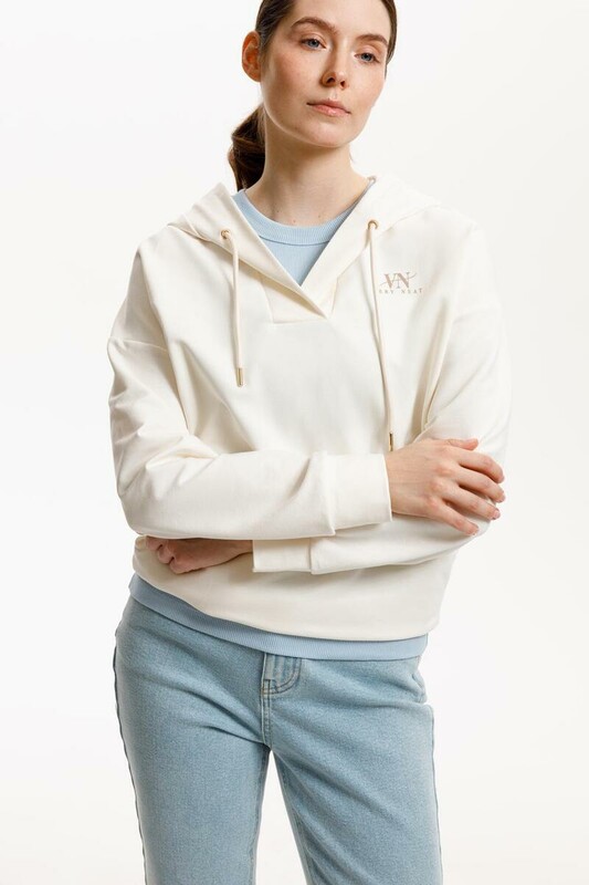 Подарите себе ощущение комфорта и уюта с худи из мягкого эластичного футера в теплом молочном оттенке. Спущенные плечи, удлиненная спинка и объёмный капюшон в сочетании с вместительными карманами придают изделию расслабленный вид.