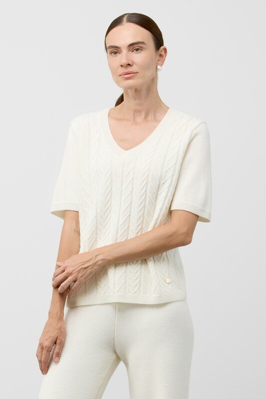 Короткий рукав и рельефная текстура придают джемперу современный вид, идеально сочетающийся с различными стилями одежды.
