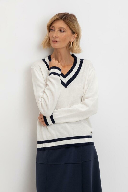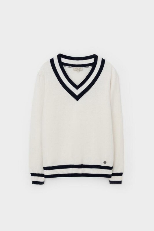 Гладкий хлопковый джемпер с V-вырезом является основой любого гардероба. Его дополняет не менее классическая отделка контрастными деталями, а спущенная линия плеч завершает его комфортной посадкой.
