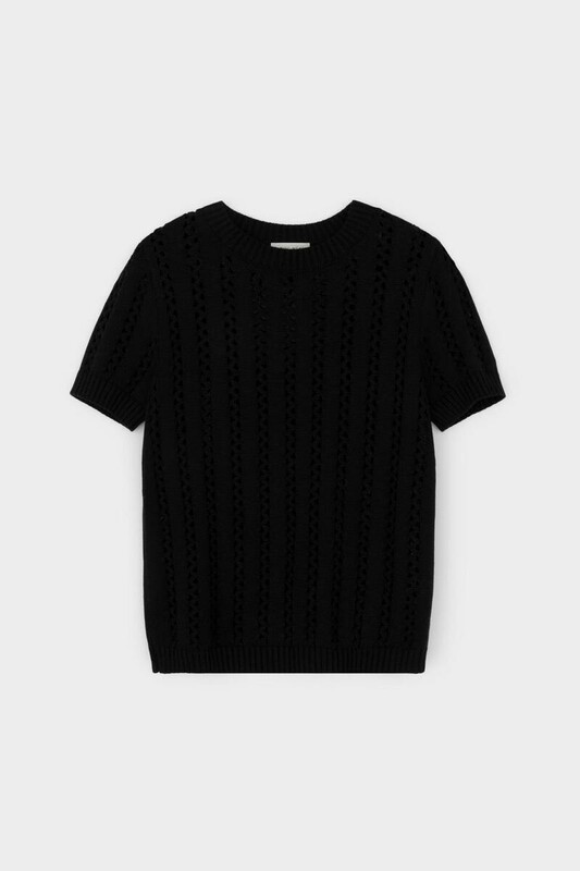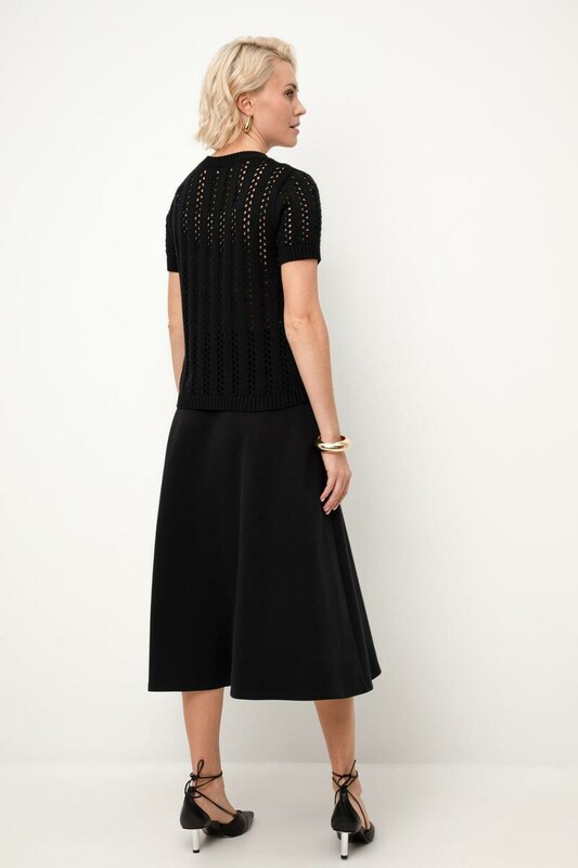 Джемпер из итальянской хлопковой пряжи выполнен ажурной, воздушной вязкой. Черный цвет и фактура делают его универсальным для различных образов.