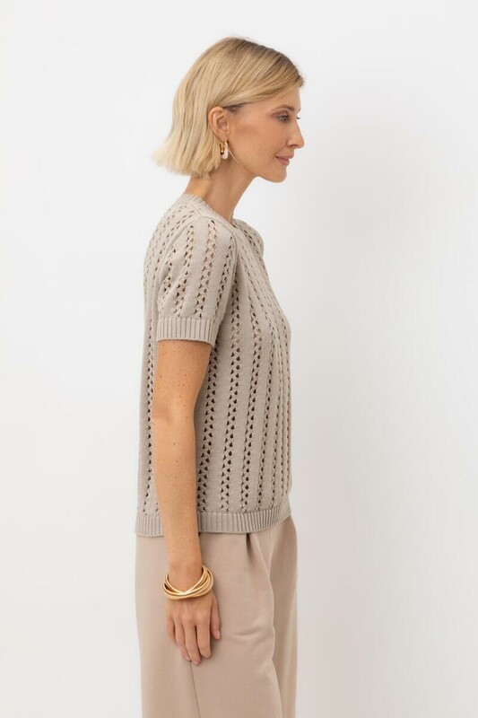 Джемпер из итальянской хлопковой пряжи выполнен ажурной, воздушной вязкой. Бежевый цвет и фактура делают его универсальным для различных образов.