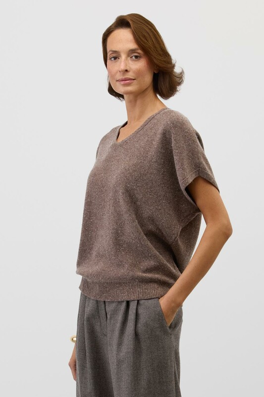 Джемпер с коротким руковом из уникальной коллекции премиальных изделий, выполненных из итальянской пряжи, включает в себя мягчайшую шерсть мериноса и натуральный шелк. Это идеальное сочетание обеспечивает комфортное прилегание к телу, отличную терморегуляцию, воздухопроницаемость и отсутствие раздражения даже на самой чувствительной коже. Гладкая текстура с изысканными вкраплениями выглядит особенно стильно и современно.