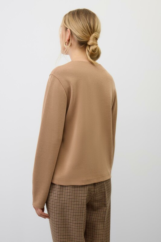 Модель имеет классический круглый вырез, что делает ее универсальной. Удобный прямой крой и рельефный шов, расположенный по центру, добавляют изделию оригинальности.