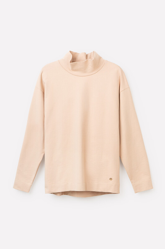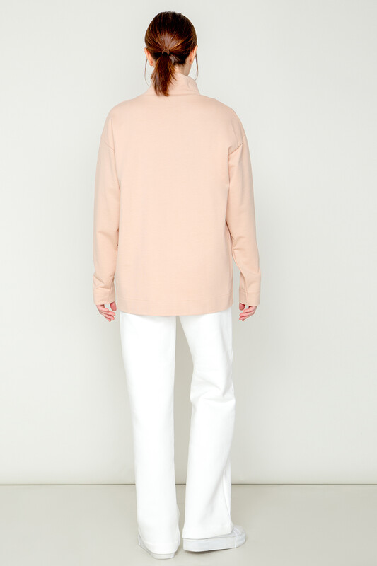 Базовый однотонный джемпер из петельчатого футера с высоким воротником и спущенными плечами. В составе изделия 100% натуральный хлопок. Свободная посадка, объёмный силуэт..