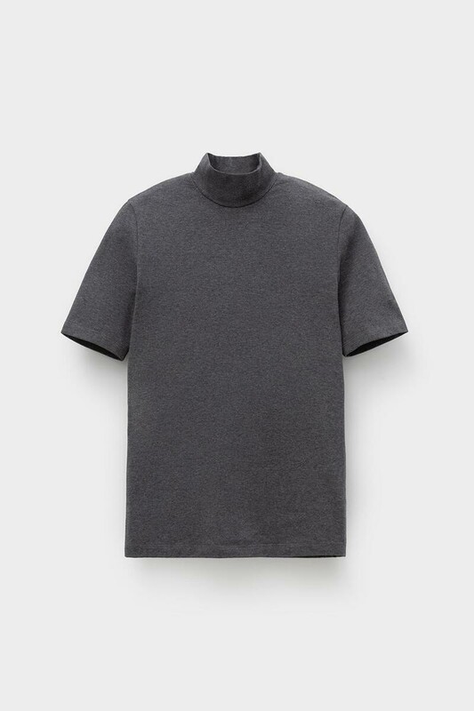 Базовый джемпер с короткими рукавами и воротником-стойкой из плотного однотонного трикотажа супрем с добавлением спандекса.