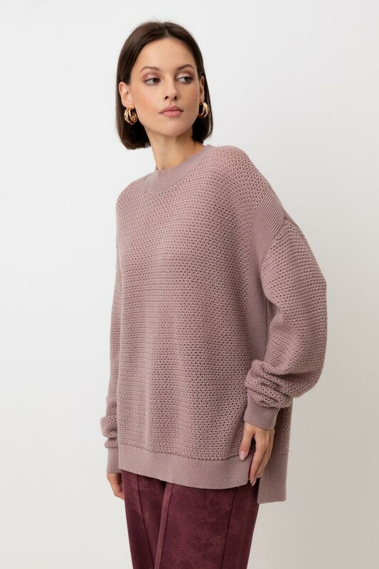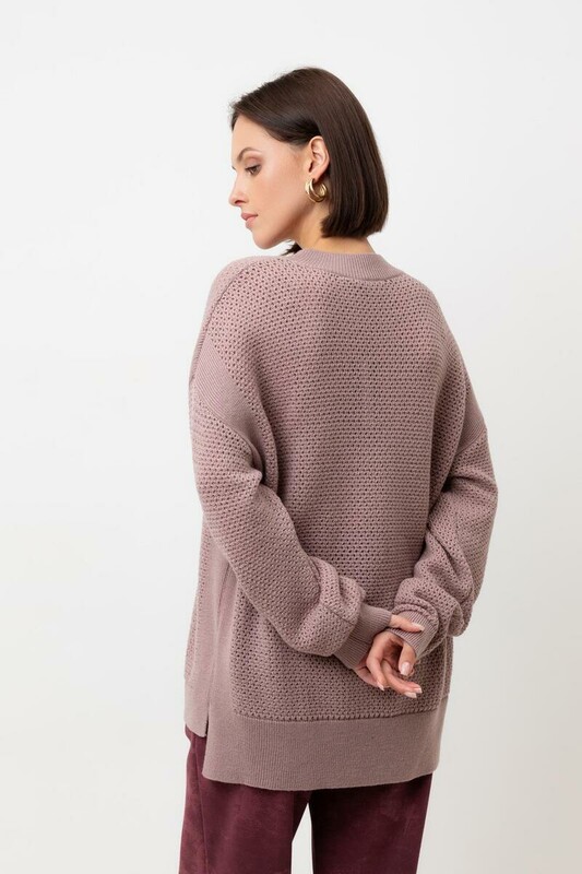 Джемпер с удлиненной спинкой и разрезами по бокам связан ажурной вязкой "волна". Средняя плотность вязания и пластичная фактура сохраняют форму изделия.