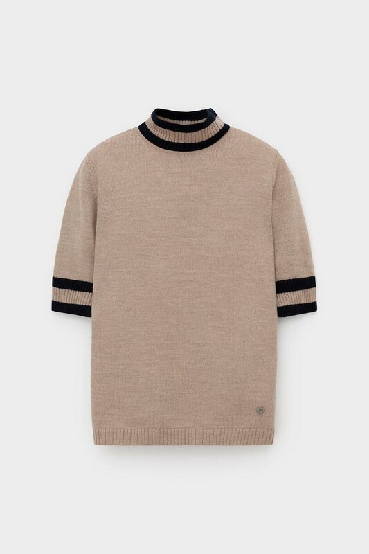 Джемпер в стиле прямой футболки, воротником-стойкой и короткими рукавами. Прямой силуэт, стандартная длина. Средняя плотность вязания, пластичная фактура. Выполнен гладью из мягкой полушерстяной пряжи. Шерсть в составе сохраняет тепло, а благодаря волокнам акрила изделие мягкое и дольше сохраняет форму.