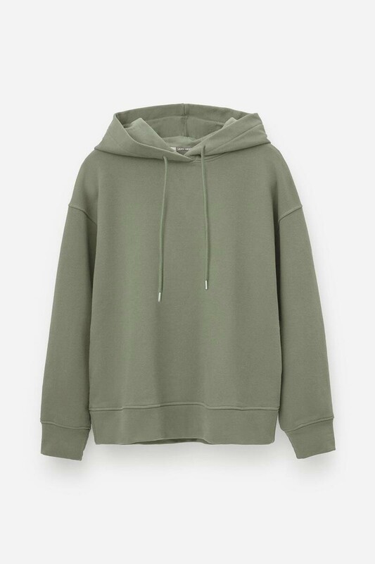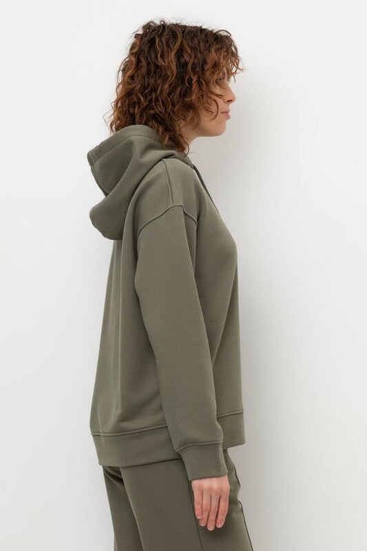 Толстовка с капюшоном и боковыми карманами из петельчатого футера трехнитки. В составе 80% натурального хлопка и 20% полиэстера, при этом полиэстер ввязан внутрь по особой технологии и не соприкасается с кожей. Спущенные рукава, манжеты из основного полотна. Свободный силуэт.