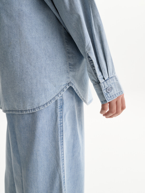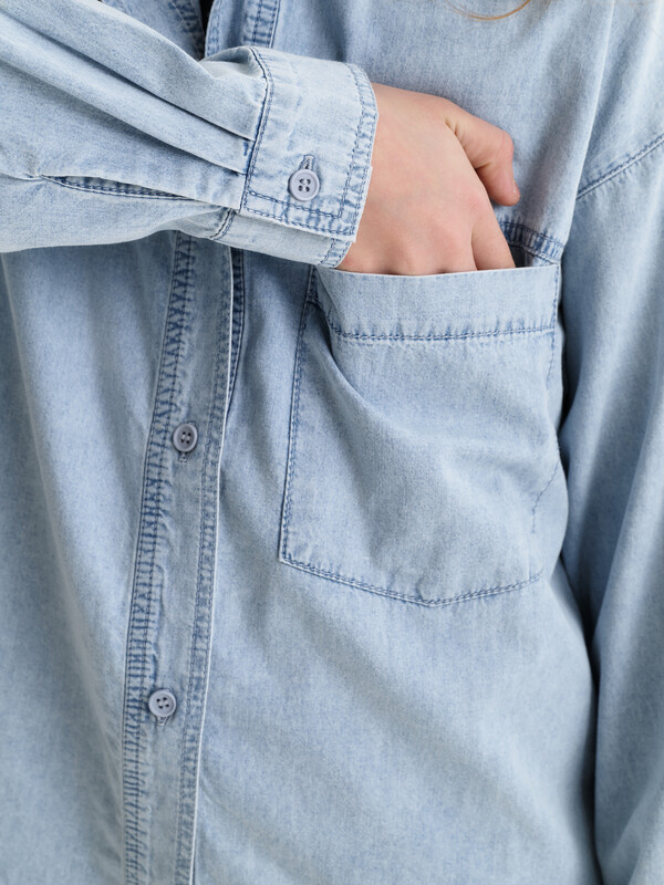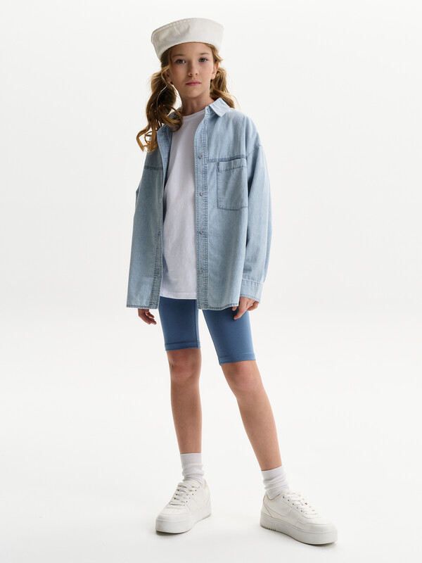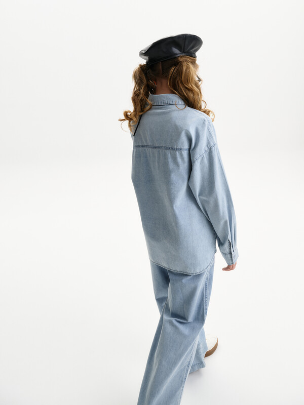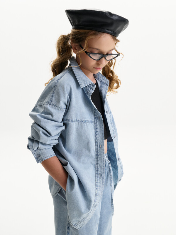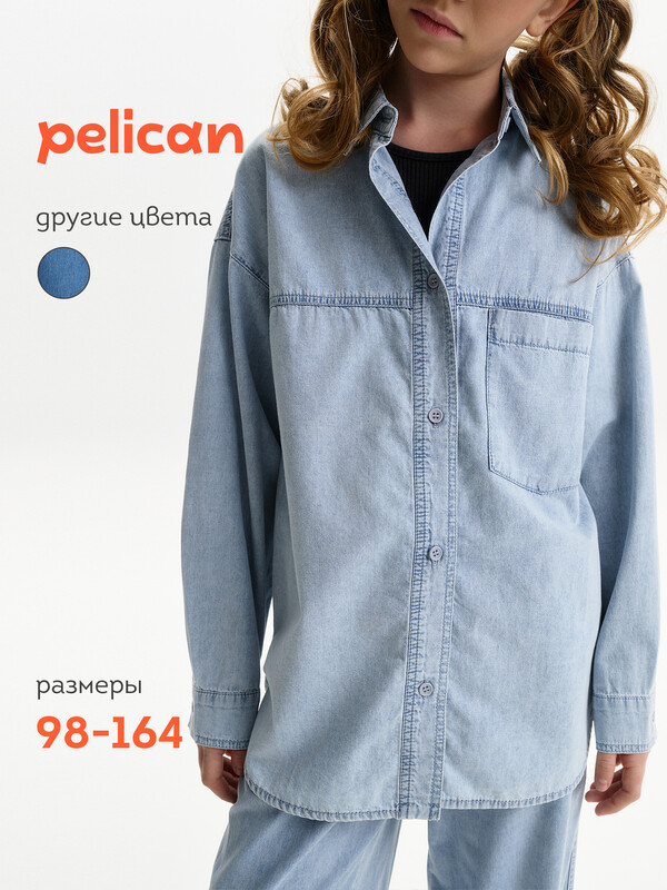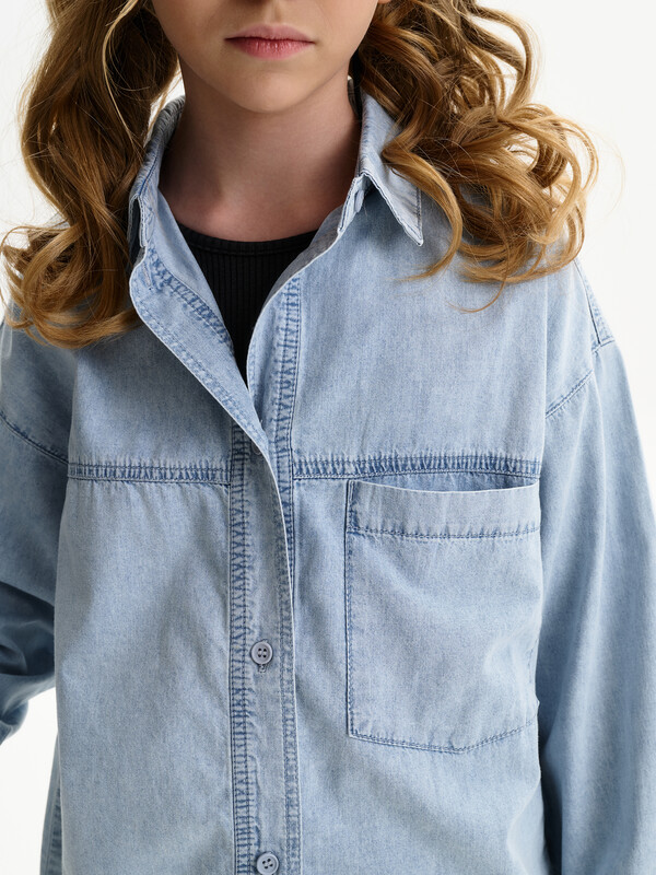 Джинсовая рубашка для девочки. Свободная рубашка прямого кроя с классическим отложным воротником и спущенным плечом подарит ребёнку комфорт и не будет стеснять его движений. Модель застёгивается на пуговицы по переду. По низу рукавов манжеты на пуговицах. Спереди слева удобный накладной карман для мелочей. Фигурная линия низа, кокетки по переду и спинке придают изысканности. Изделие лаконичного дизайна, без принта. Модель неприхотлива в уходе. В составе ткани 100% высококачественного хлопка — рубашка мягкая и воздухопроницаемая. Изделие выполнено в джинсовом синем цвете с актуальным эффектом мягкой варки garment wash. Рубашка легко сочетается с различными брюками, джинсами, легинсами. Размерная линейка: 3 (98); 4 (104); 5 (110); 6 (116); 7 (122); 8 (128); 9 (134); 10 (140); 11 (146). Идеальная рубашка на девочку дошкольного и младшего школьного возраста, а также девочку-подростка. Рубашка джинсовая подходит для круглогодичной носки: летом, осенью, зимой, весной и демисезон. Её можно носить в детский сад, на прогулки, отдых, а также дома. В прохладную погоду летом рубашку можно надеть на футболку или топ, а зимой она послужит средним слоем одежды. Модная рубашка — отличный подарок дочери, внучке или сестре на любой праздник или просто в качестве знака внимания и заботы. Выбирайте нужный размер по таблице размеров на фото. Цвет товара на экране вашего устройства может отличаться от цвета изделия вживую.