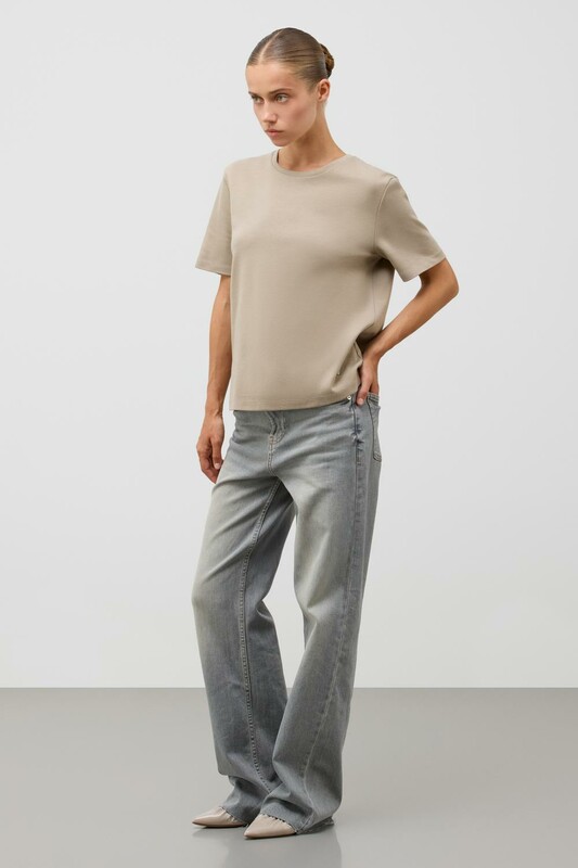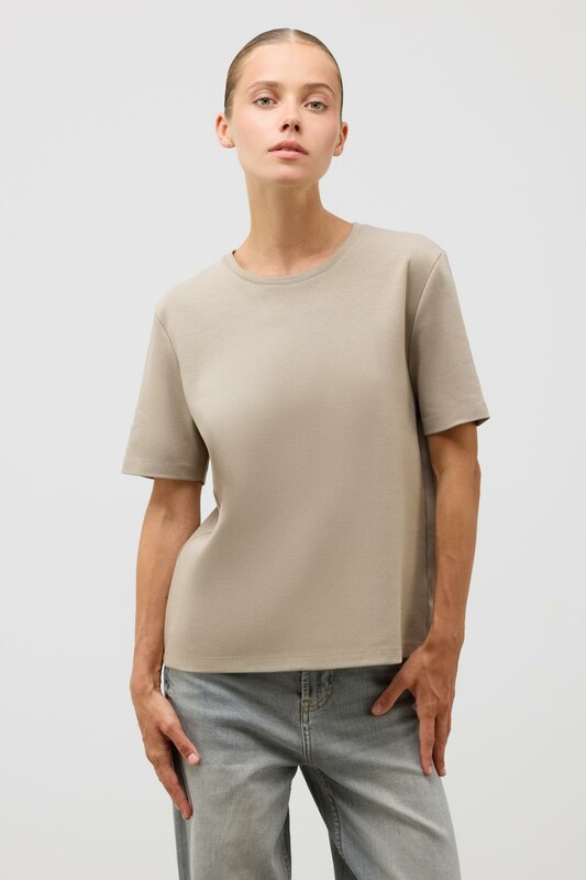 Базовая футболка из премиального трикотажа DOUBLE FACE. Трикотаж прошел особую обработку силиконом, что придает ему легкость и шелковистость текстуры. Имеет классический круглый вырез и удобный прямой крой.