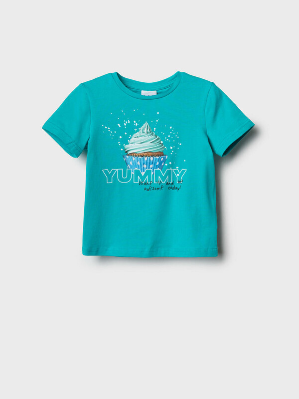 Детская футболка для девочки. Модель прямого кроя, выполнена из эластичного хлопкового трикотажа джерси. Спереди расположен крупный принт с капкейком. Горловина круглая.