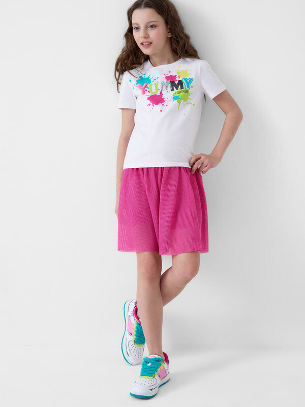 Футболка оверсайз для девочки подростка. Модель выполнена из эластичного хлопкового трикотажа джерси. На груди расположен крупный красочный принт. Горловина круглая. В нижней части — небольшая нашивка.