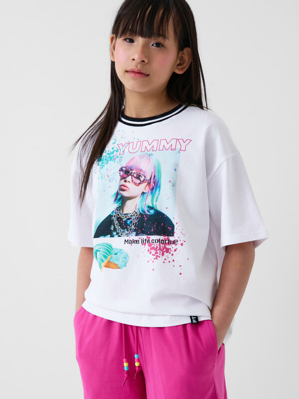 Футболка оверсайз для девочки подростка. Модель выполнена из эластичного хлопкового трикотажа джерси. На груди расположен крупный красочный принт. Горловина круглая, обработана эластичным рибом. В нижней части — небольшая нашивка.