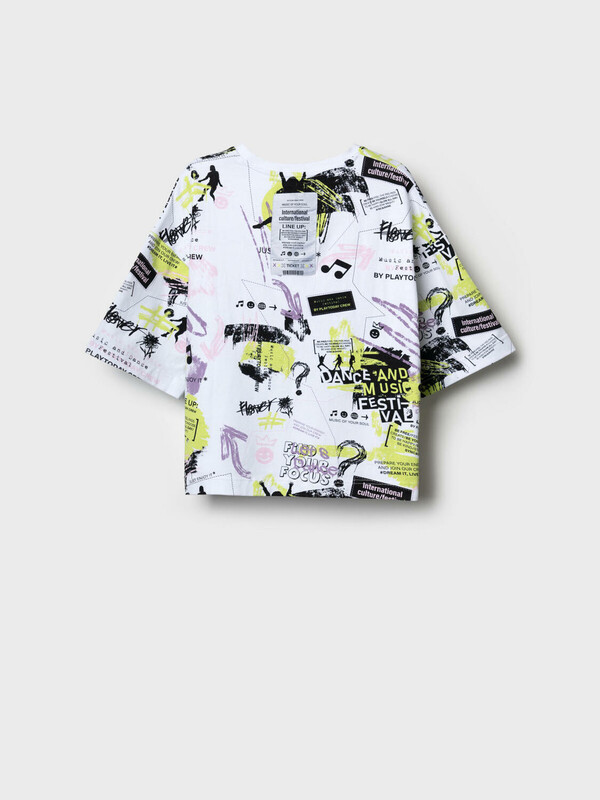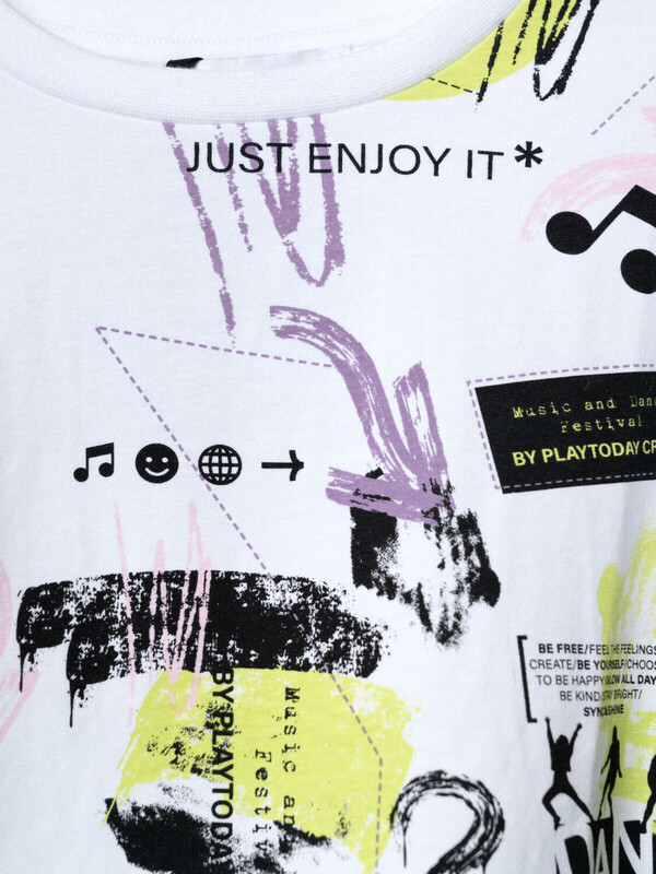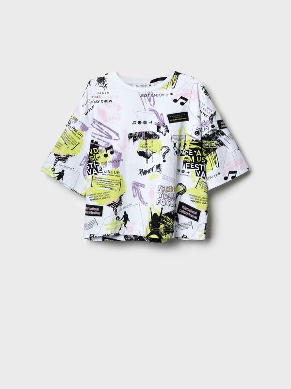 Футболка оверсайз для девочки подростка. Модель выполнена из эластичного хлопкового трикотажа джерси. Яркие принты в стиле граффити. Горловина круглая, обработана эластичным рибом.