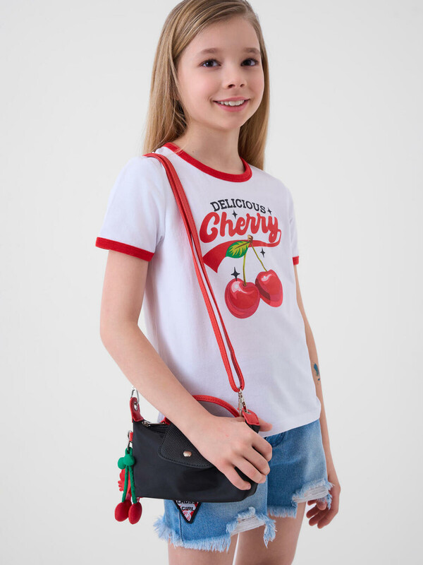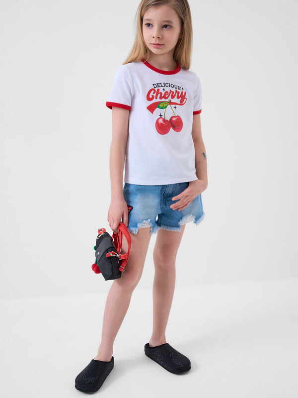 Футболка для девочки подростка. Модель прямого кроя, выполнена из эластичного хлопкового трикотажа джерси. На груди расположен крупный принт с изображением вишен. Горловина круглая.