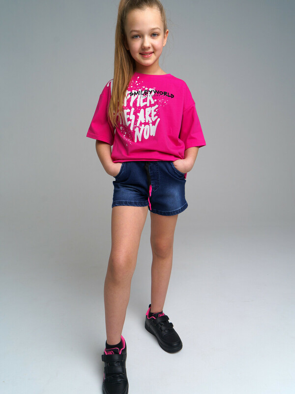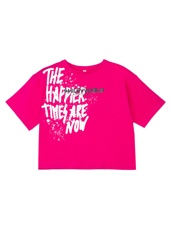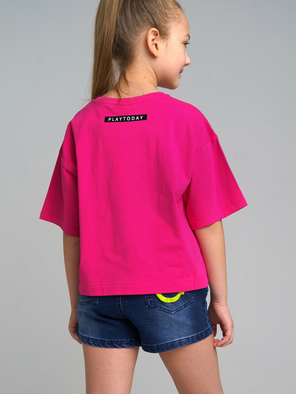Футболка укороченная свободного силуэта из качественного и приятного на ощупь трикотажа джерси. Высокое содержание хлопка 95%. Благодаря наличию эластана в составе ткани изделие проще в уходе и держит форму.