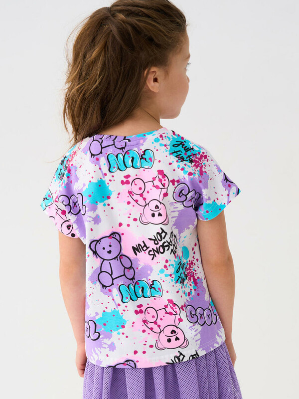 Детская футболка для девочки. Модель прямого кроя, выполнена из эластичного хлопкового трикотажа джерси. Красочный принт с милыми мишками. Горловина круглая.