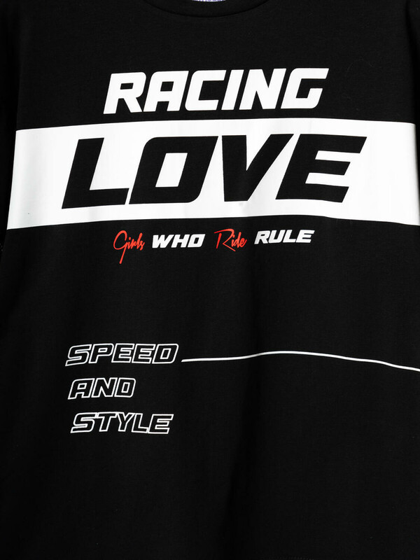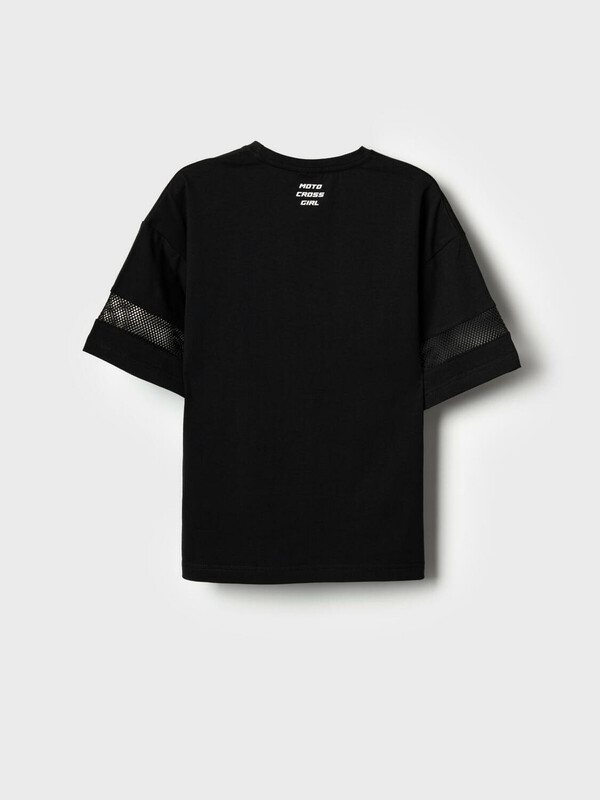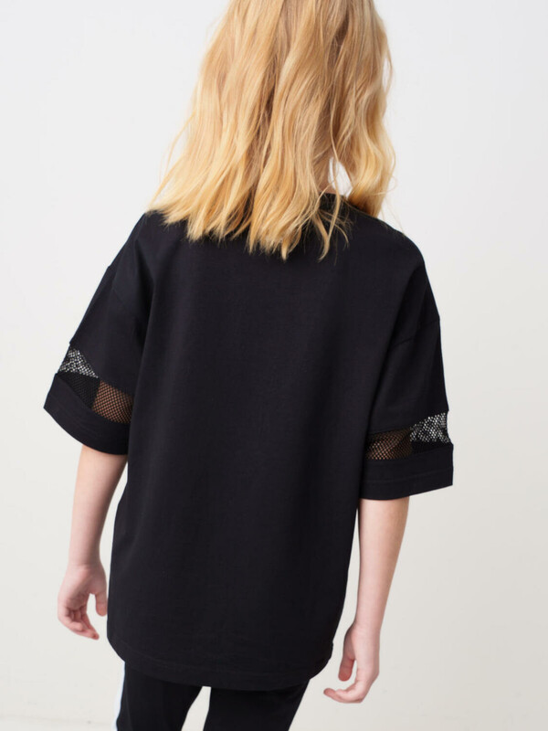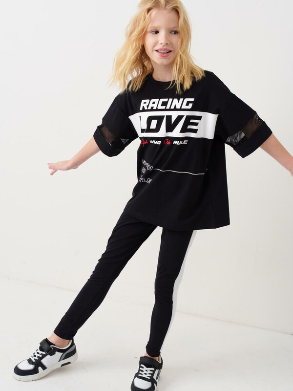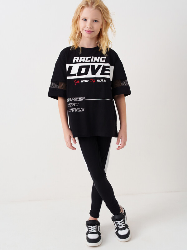 Футболка оверсайз для девочки подростка. Модель выполнена из эластичного хлопкового трикотажа джерси. На груди расположен крупный принт в гоночной тематике. Горловина круглая. Рукава со ставками из сетки.