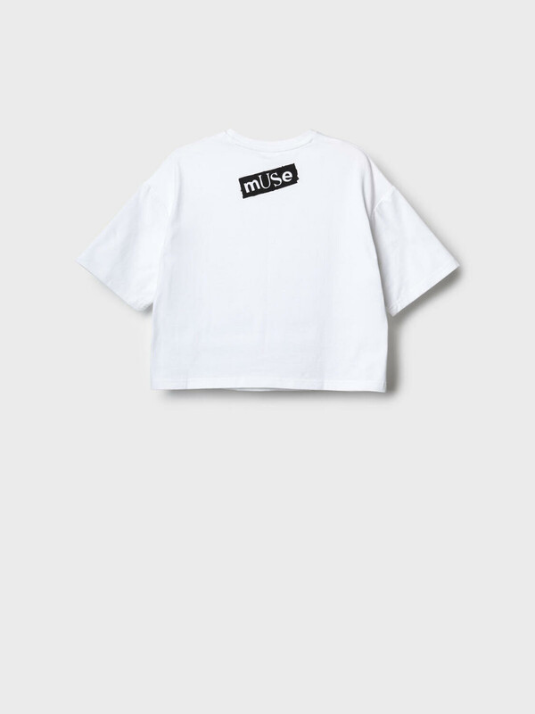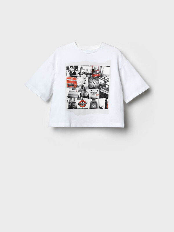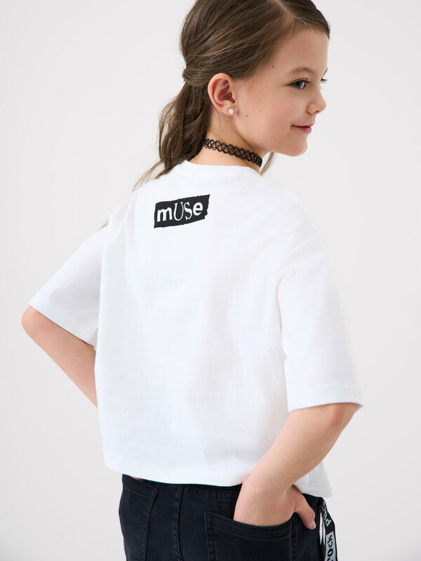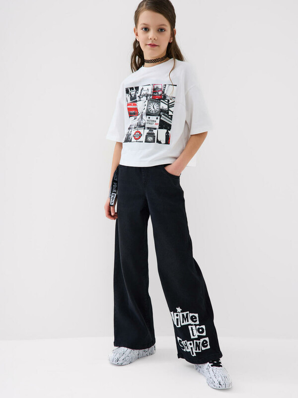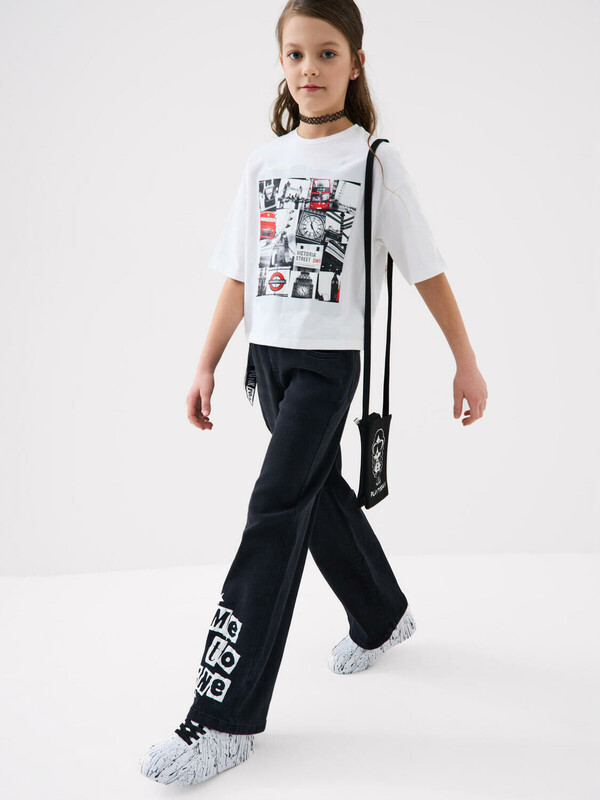 Футболка оверсайз для девочки подростка. Модель выполнена из эластичного хлопкового трикотажа джерси. На груди и спинке расположен красочный принт. Горловина круглая.