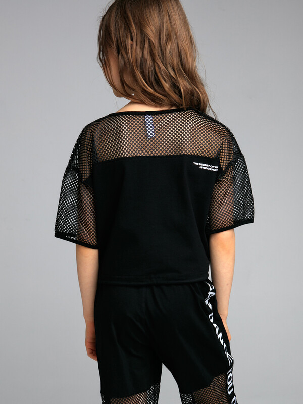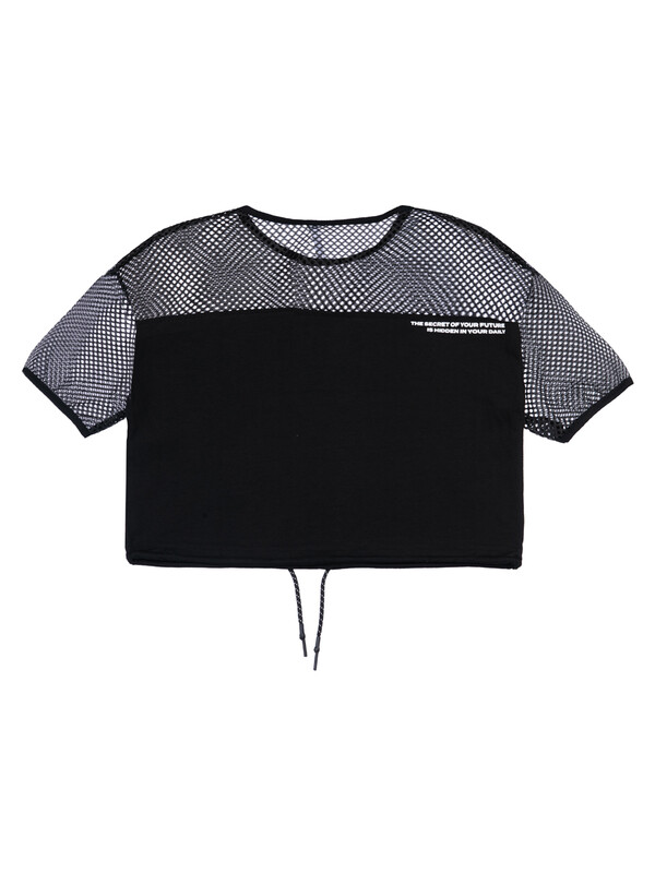 Футболка укороченная из качественного и приятного на ощупь трикотажа джерси с декором из сетки. Высокое содержание хлопка 95%, а благодаря наличию эластана в составе ткани, изделие проще в уходе и держит форму.