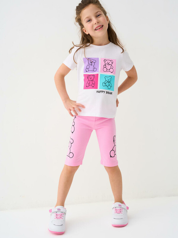Детская футболка для девочки. Модель прямого кроя, выполнена из эластичного хлопкового трикотажа джерси. Красочный принт с милыми мишками. Горловина круглая.