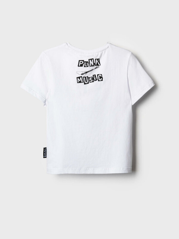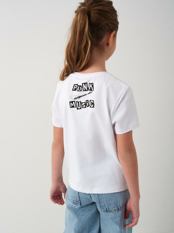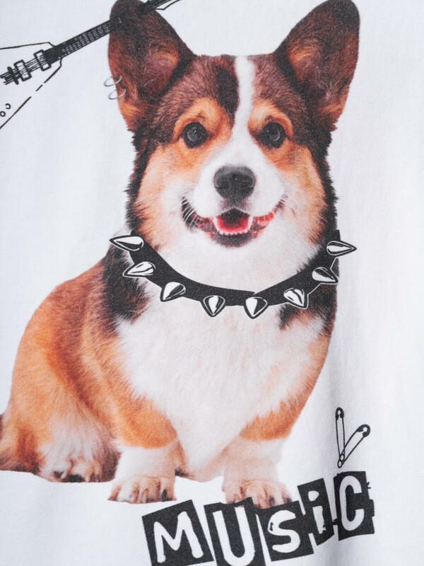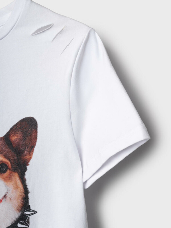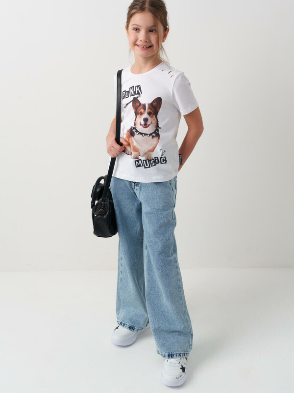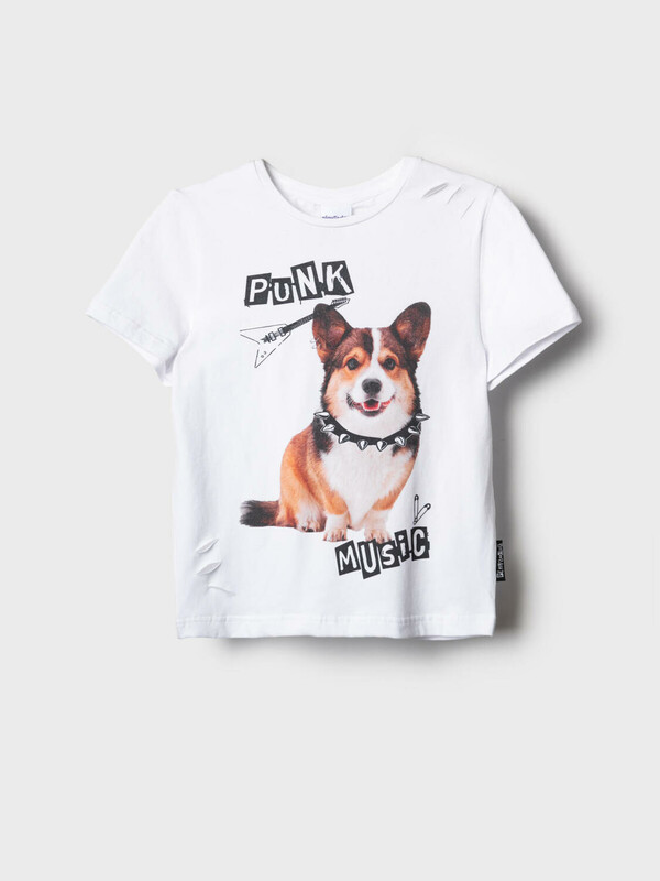Футболка для девочки подростка. Модель выполнена из эластичного хлопкового трикотажа джерси. На груди расположен крупный принт с изображением собаки. Горловина круглая. Дополнительные элементы дизайна — декоративные разрезы и боковая лента с логотипом бренда.