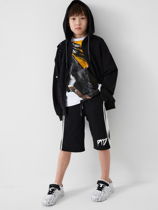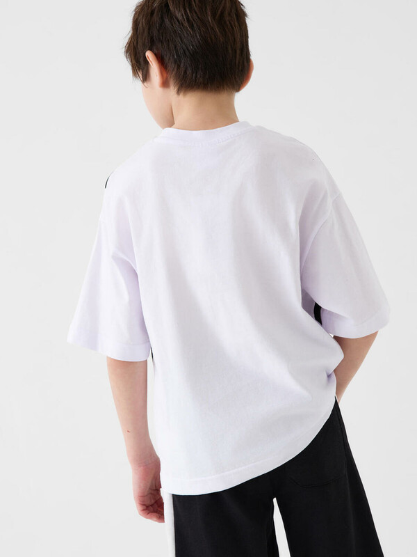 Футболка оверсайз для мальчика подростка. Модель выполнена из эластичного хлопкового трикотажа джерси. На груди расположен крупный принт с изображением скейтера. Горловина круглая, обработана эластичным рибом.