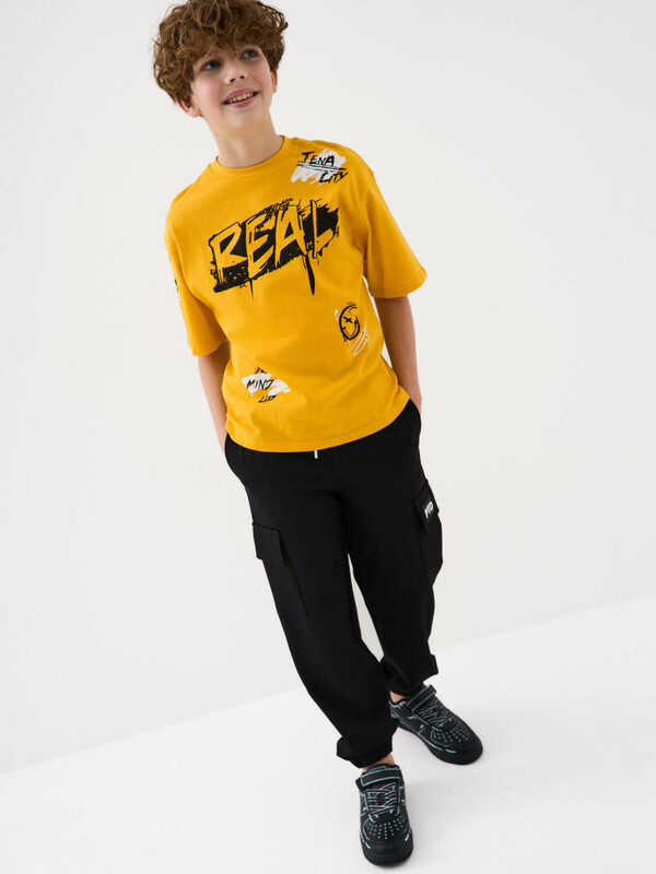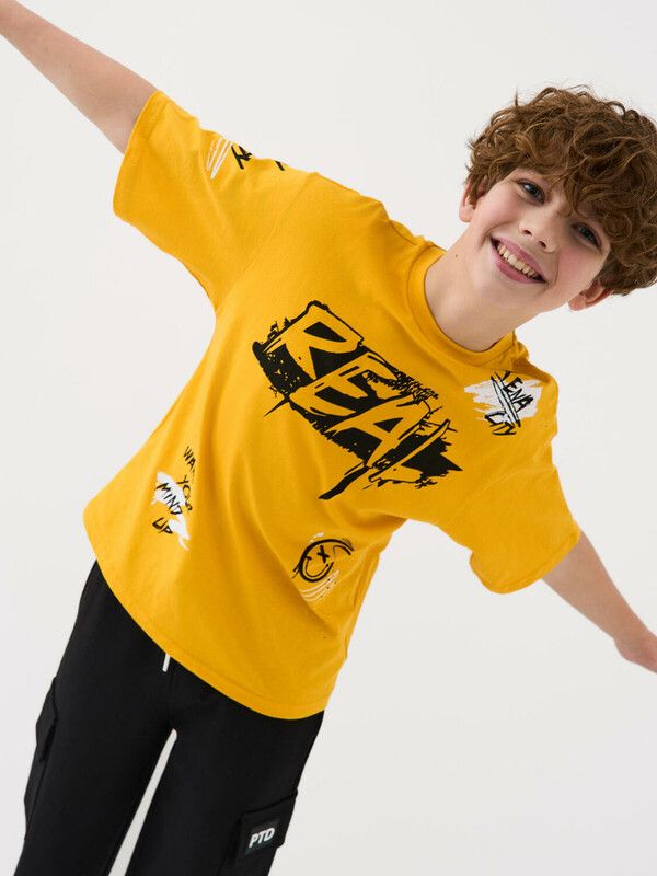 Футболка оверсайз для мальчика подростка. Модель выполнена из эластичного хлопкового трикотажа джерси. Спереди и по спинке расположен крупный принт в стиле граффити. Горловина круглая, обработана эластичным рибом.