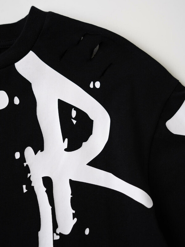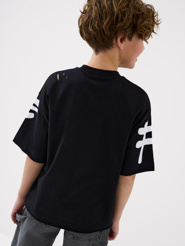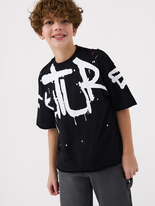 Футболка оверсайз для мальчика подростка. Модель выполнена из эластичного хлопкового трикотажа джерси. На груди расположен крупный принт в стиле граффити. Горловина круглая, обработана эластичным рибом. Декоративные разрезы.