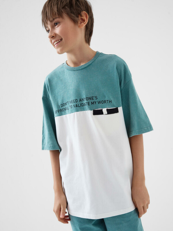 Футболка свободного кроя с короткими рукавами для мальчика подростка. Модель выполнена в силуэте оверсайз. Изделие выполнено из мягкого трикотажа, воротник выполнен из эластичного риба. Выразительный текстовый принт. Ниже принта — декоративные ленты и кнопка, создающие акцент. По низу переда добавлена декоративная жаккардовая нашивка с надписью.