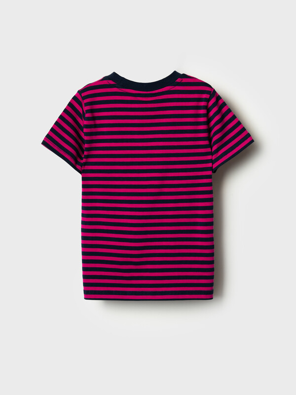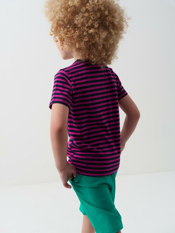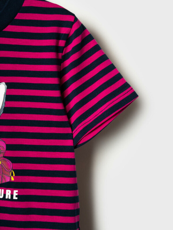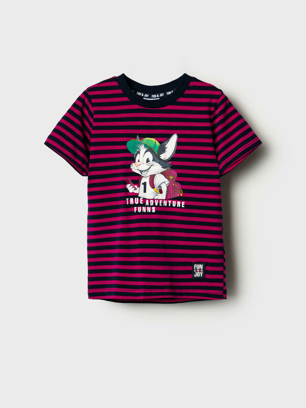 Детская футболка для мальчика. Модель прямого кроя, выполнена из эластичного хлопкового трикотажа джерси. Спереди расположен принт. Горловина круглая, обработана эластичным рибом. В нижней части — небольшая силиконовая нашивка.