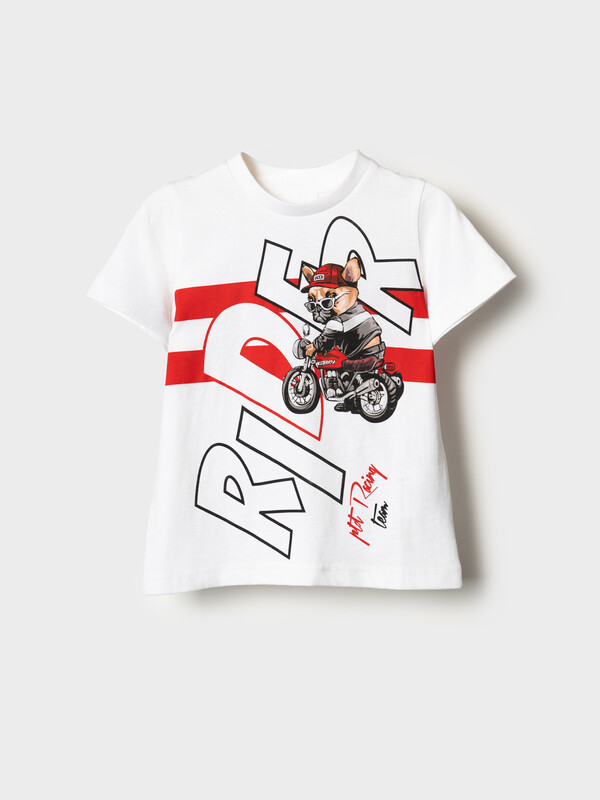 Детская футболка для мальчика. Модель прямого кроя, выполнена из эластичного хлопкового трикотажа джерси. Крупный принт в гоночной тематике. Горловина круглая, обработана эластичным рибом.