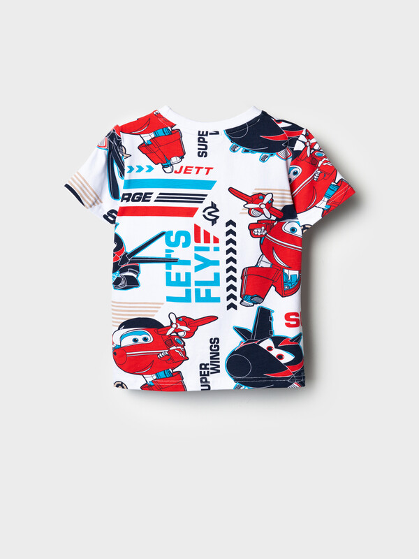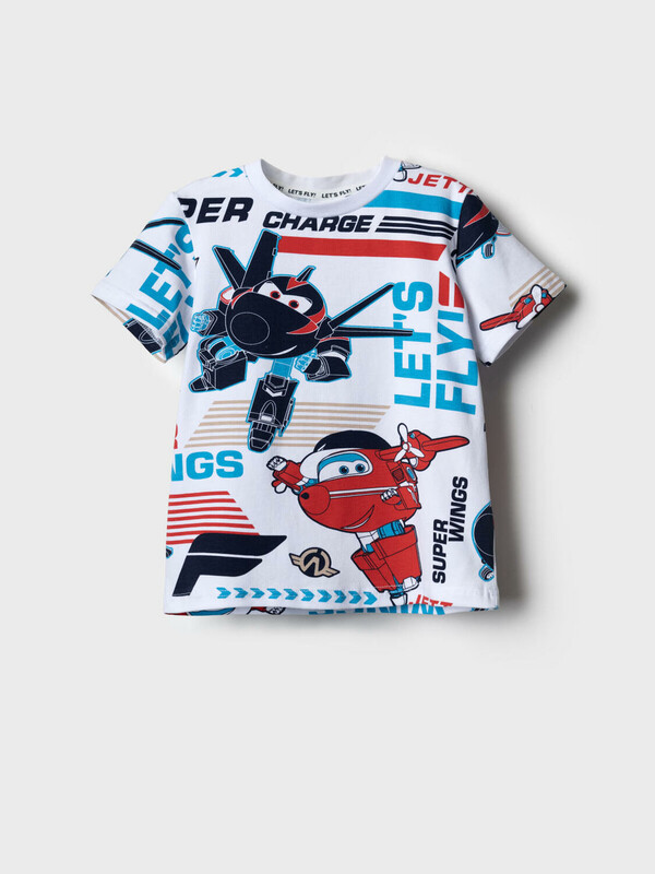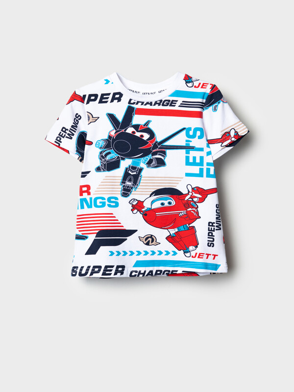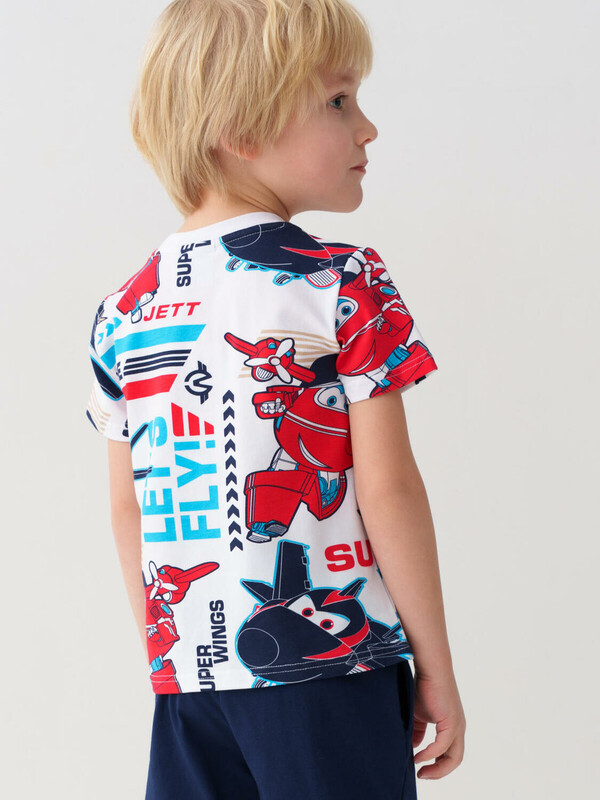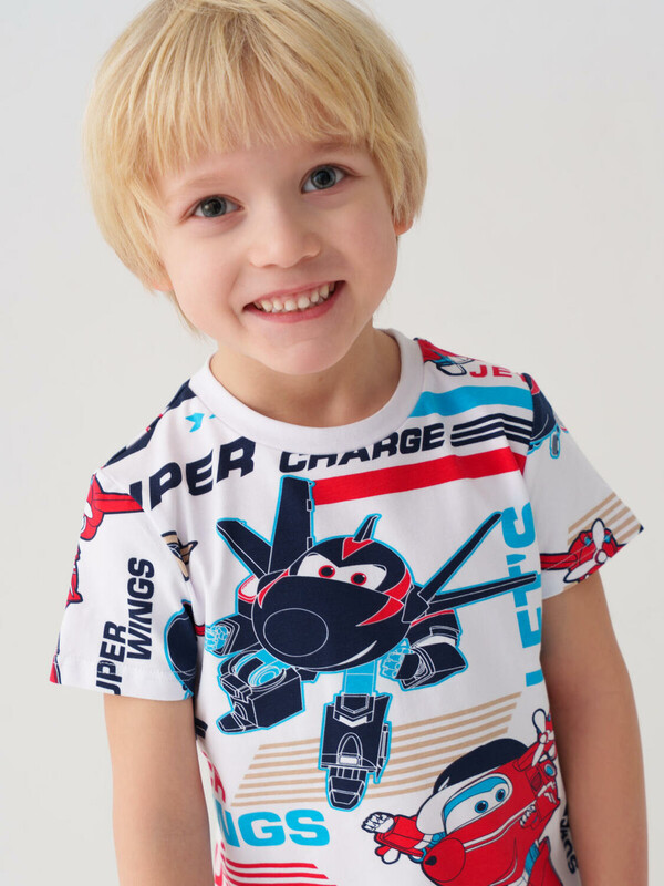 Детская футболка для мальчика. Модель прямого кроя, выполнена из эластичного хлопкового трикотажа джерси. Яркие принты с мультяшными героями "Super Wings". Горловина круглая, обработана эластичным рибом.