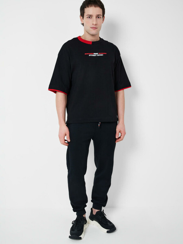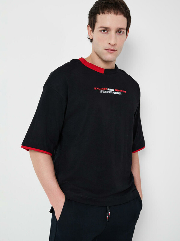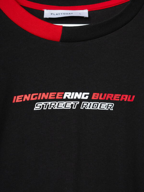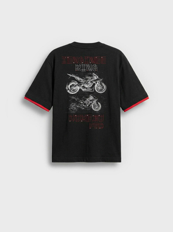Мужская футболка оверсайз. Модель выполнена из эластичного хлопкового трикотажа джерси. Принты в гоночной тематике. Горловина обработана эластичным рибом. По низу изделия декоративная нашивка.