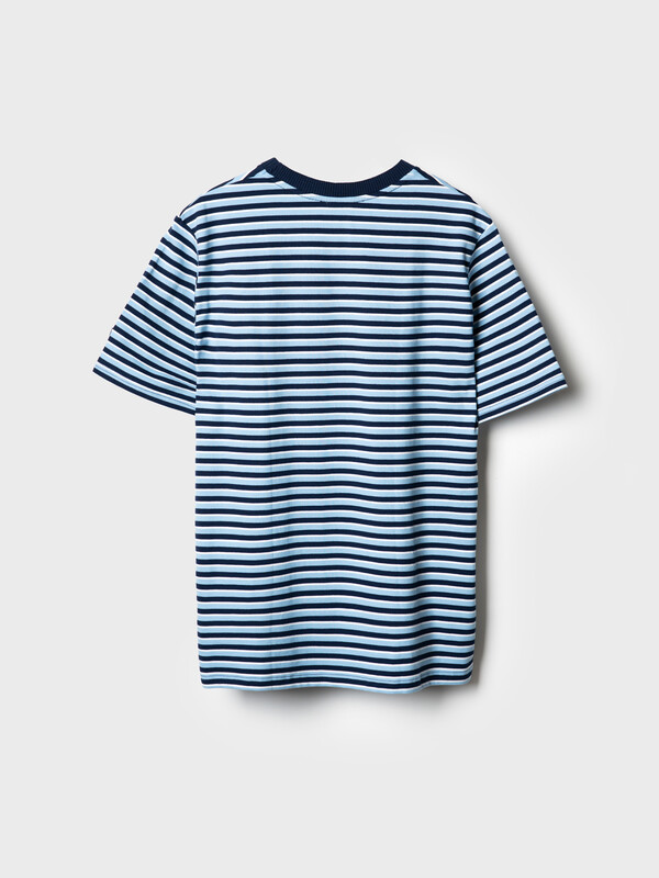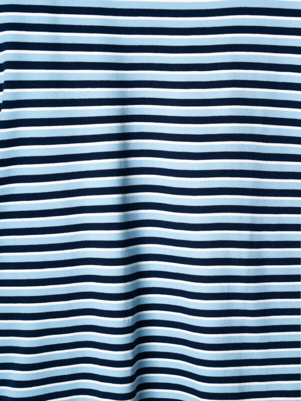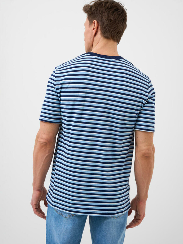 Мужская футболка в полоску. Модель прямого кроя, выполнена из эластичного хлопкового трикотажа пике. Горловина круглая, обработана эластичным рибом.