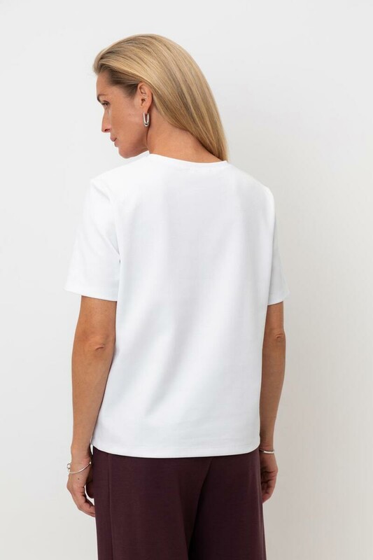 Футболка прямого силуэта, изготовленная из премиального трикотажного полотна DOUBLE FACE. Мягкий на ощупь трикотаж выполнен из высококачественной гребенной пряжи, а ее молочный оттенок добавляет летнего настроения.