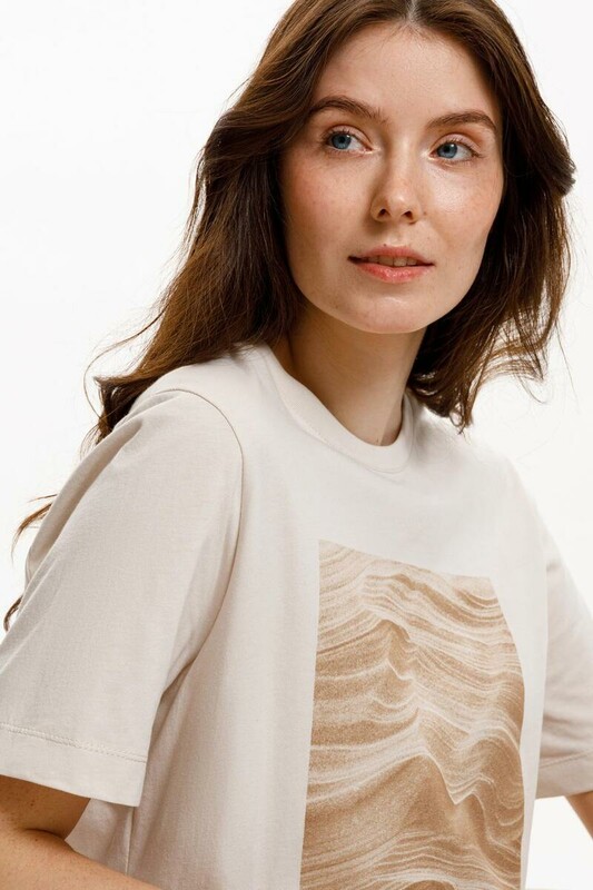 Футболка прямого силуэта из высококачественного гребенного хлопка. Мягкий на ощупь принт выполнен из водных красок, что обеспечивает устойчивость к многократным стиркам.