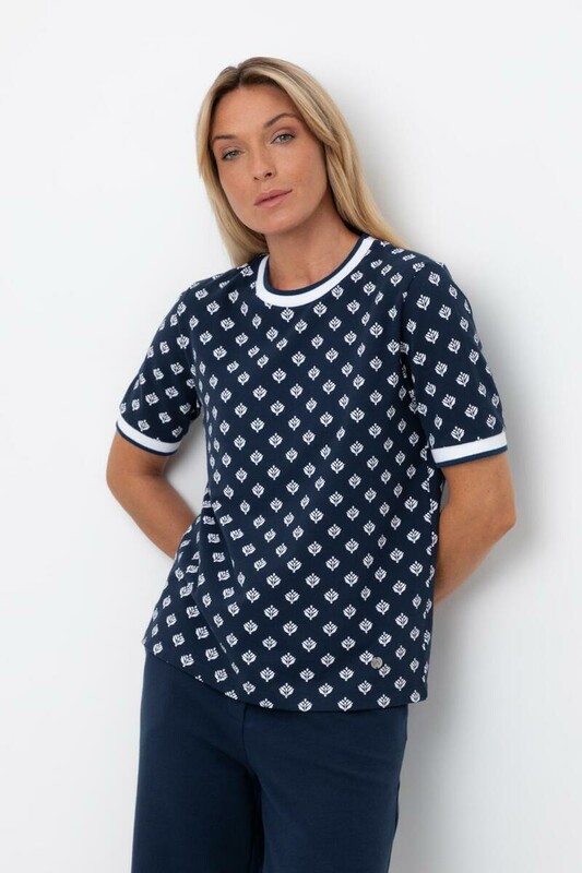 Футболка, изготовленная из 100% хлопка в переплетении пике. Дарит ощущение комфорта и легкости. Геометрический узор на глубоком синем цвете придает изделию романтический вид. Вязаный воротник и манжеты, выполненные с особым вниманием к деталям, придают изделию аккуратный и завершенный вид.
