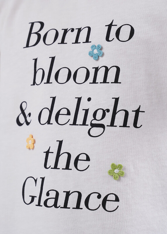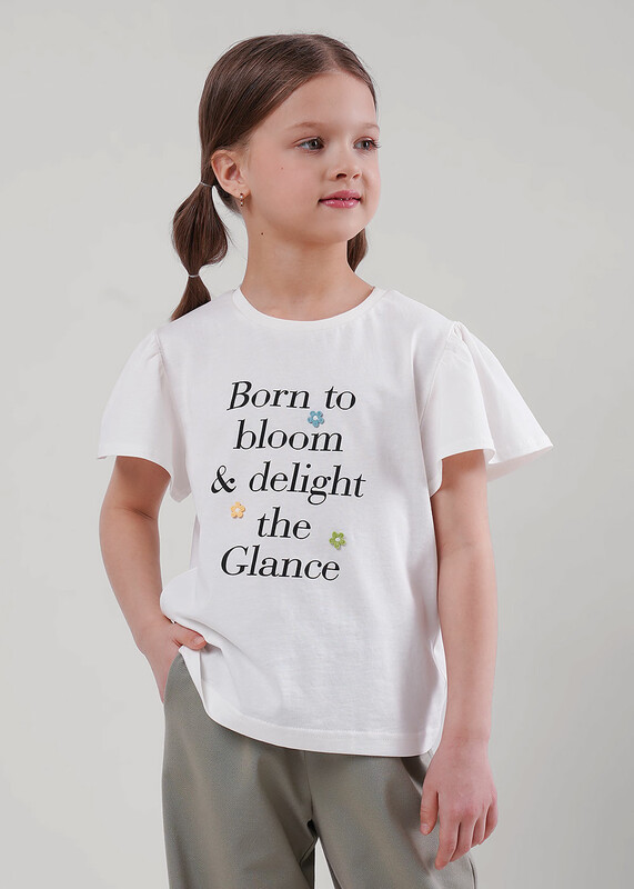 Нежная футболка из 100 % хлопка молочного цвета очаровывает с первого взгляда. Рукав-крылышко придаёт образу воздушность, стильный принт оживляет, а милые цветочки добавляют романтичный акцент.Комфортная и очаровательная-идеальный выбор для юной модницы!