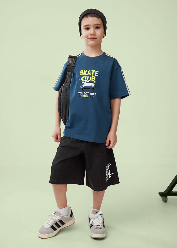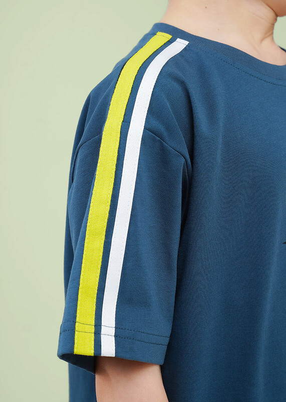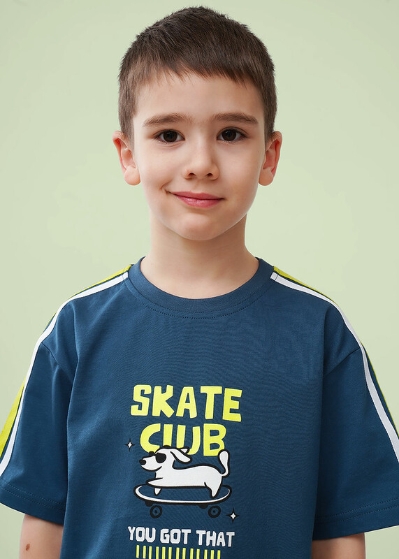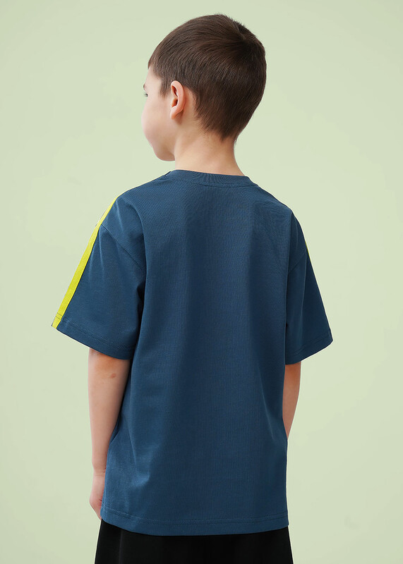 Футболка из 100% хлопка в тёмно-синем цвете. Декоративная тесьма на плечах придаёт модели особый стиль, а принт на передней части добавляет индивидуальности. Идеально сочетается с шортами из новой коллекций-готовый образ для активных летних дней!