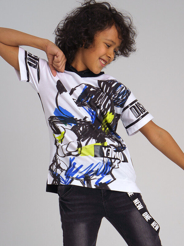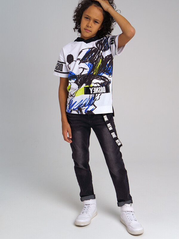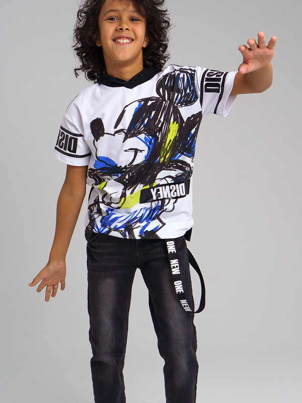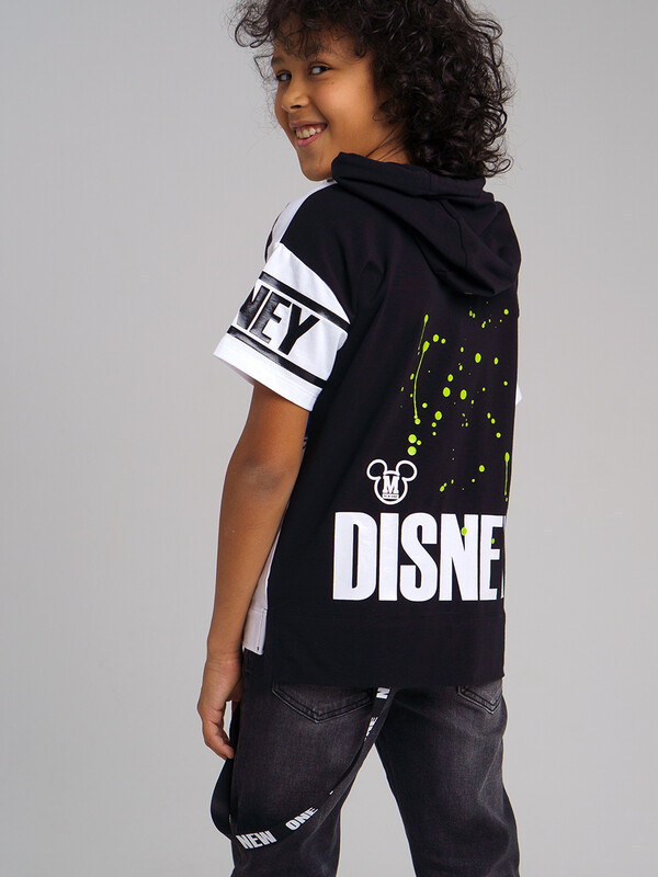 Футболка с капюшоном из качественного приятного на ощупь трикотажа с принтом Disney. Размер изделия на фото - 140, параметры модели (см): рост 145,5, обхват груди-талии-бедер: 67-62-71. Высокое содержание хлопка. Благодаря наличию эластана в составе ткани, изделие проще в уходе и держит форму.