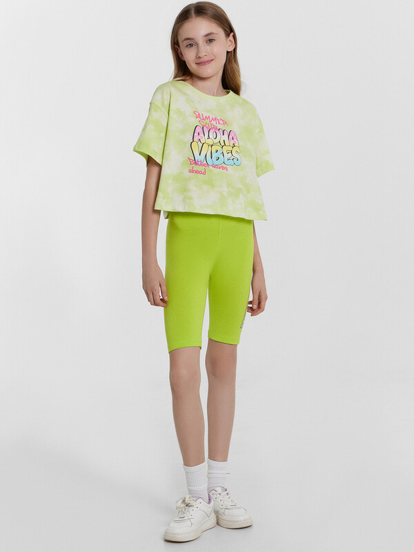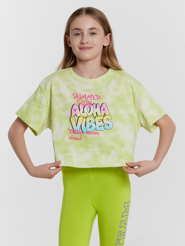 Укороченная футболка свободного силуэта из трикотажной кулирки. Пройма спущена, что дарит свободу движений. Рукава короткие. Горловина круглой формы. Идеально для шортиков или брюк с высокой посадкой!