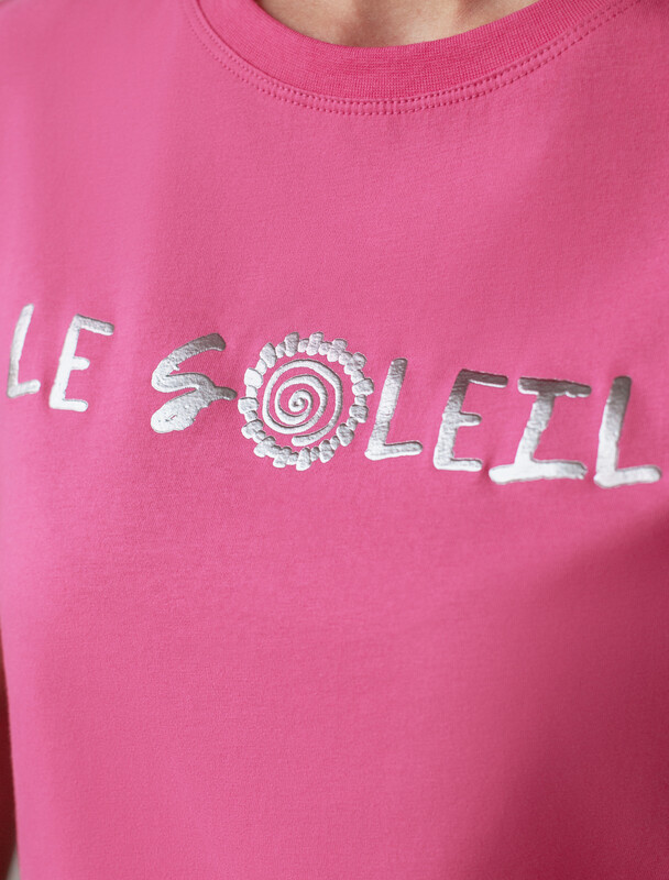 Футболка прямого кроя выполнена из 100% хлопка. Базовая модель дополнена лаконичным авторским принтом. Легко впишется в повседневный гардероб. Изделие хорошо держит форму и обеспечивает комфортный микроклимат в течение дня. Перевод надписи на принте: "le soleil (фр.) - солнце"