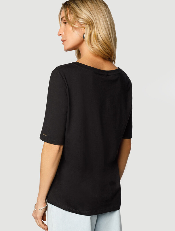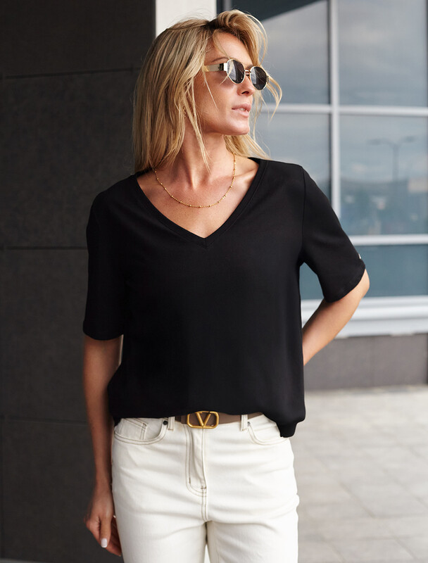 Базовая модель свободного кроя c V-вырезом легко впишется в повседненвый гардероб. Изделие хорошо держит форму и обеспечивает комфортный микроклимат в течение дня.