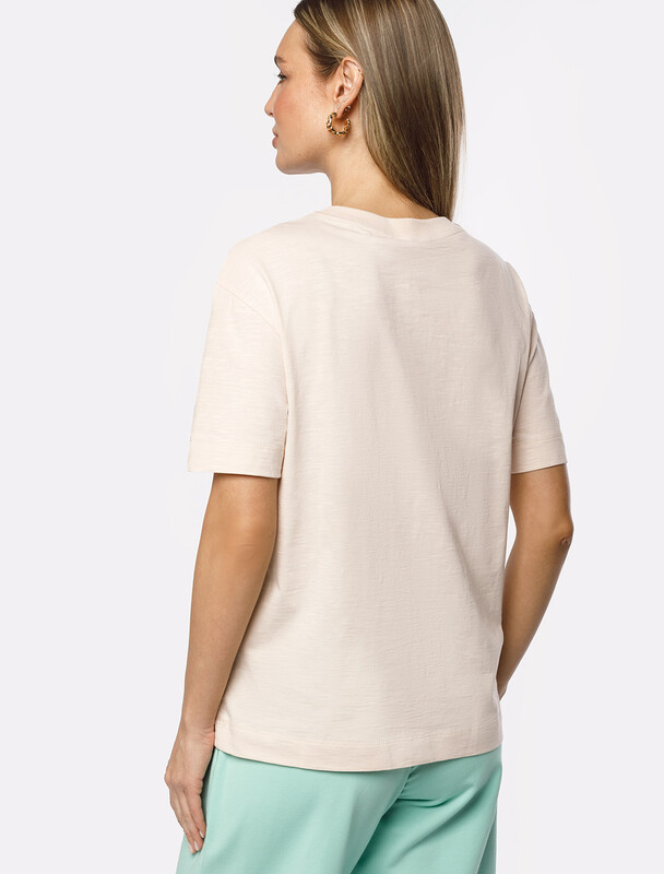 Футболка выполнена из фактурного полотна из 100% хлопка. Модель с лаконичным авторским принтом легко впишется в любой весенне-летний гардероб. Ткань имеет характерный рисунок черточки за счет сочетания разных волокон хлопка 140-150 г. Хорошо держит форму и поддерживает комфортный микроклимат в течении дня.