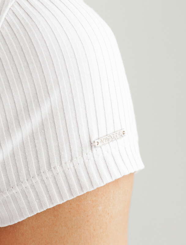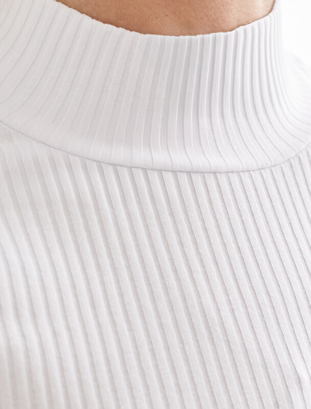 Футболка с воротом стойка выполнена из фактурного трикотажа в рубчик. Модель идеально сидит по фигуре не сковывая движения. Хлопковый трикотаж поддерживает оптимальную температуру тела, поэтому в изделии будет комфортно в течении всего дня. Наличие эластана в составе гарантирует формоустойчивости. Базовая модель впишется в любой гардероб и подойдет для офисного дресс-кода.